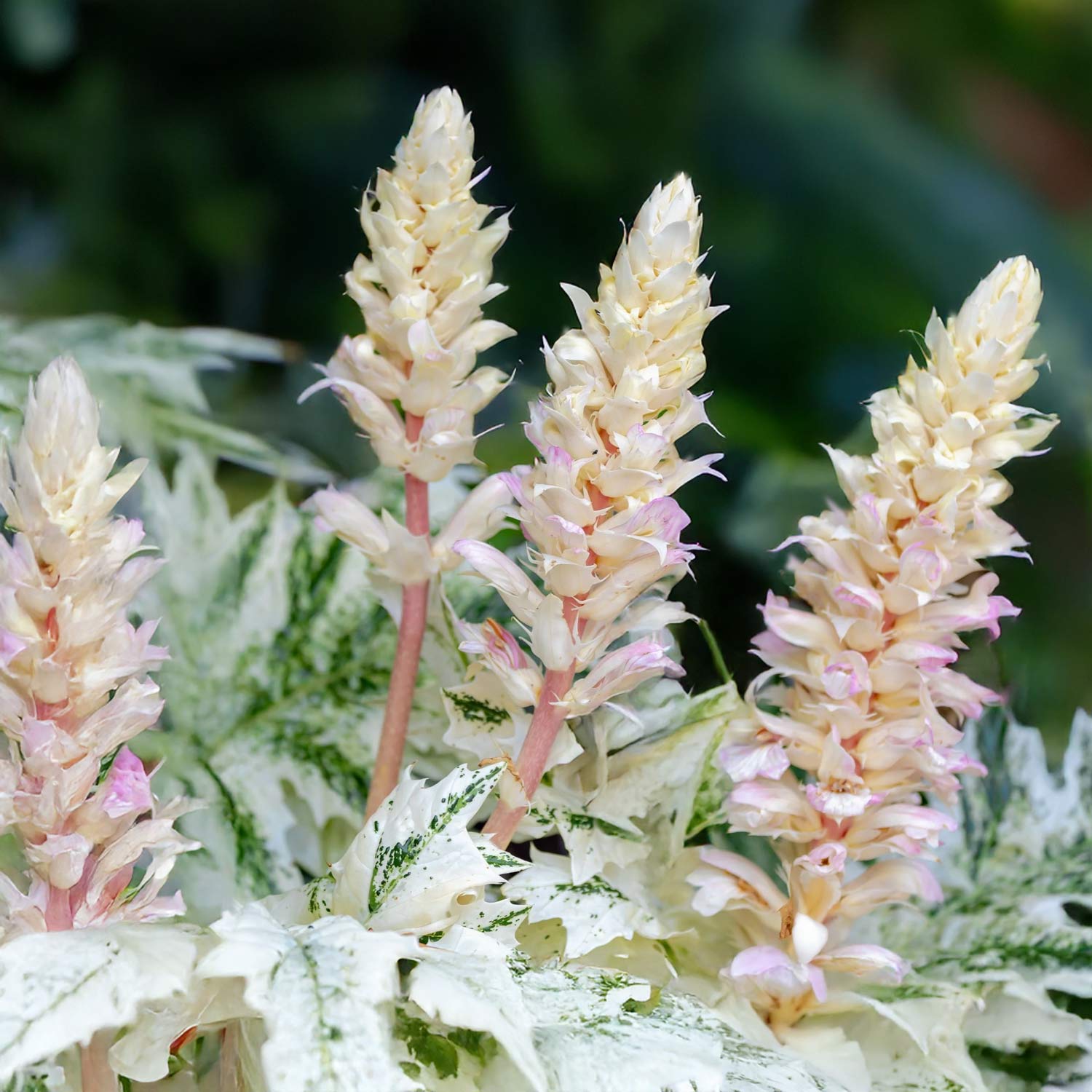 Acanthus mollis 'Tasmanian Angel' is a compact and manageable variety, with glossy, dark green leaves, accented with striking white variegation and hints of yellow when young, creating a vibrant display. In summer, flower spikes emerge, featuring elegant white flowers with soft pink bracts that add a delicate touch to the plant's bold foliage. It's a versatile addition to a variety of garden settings