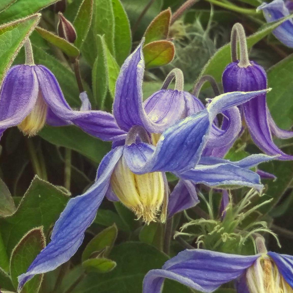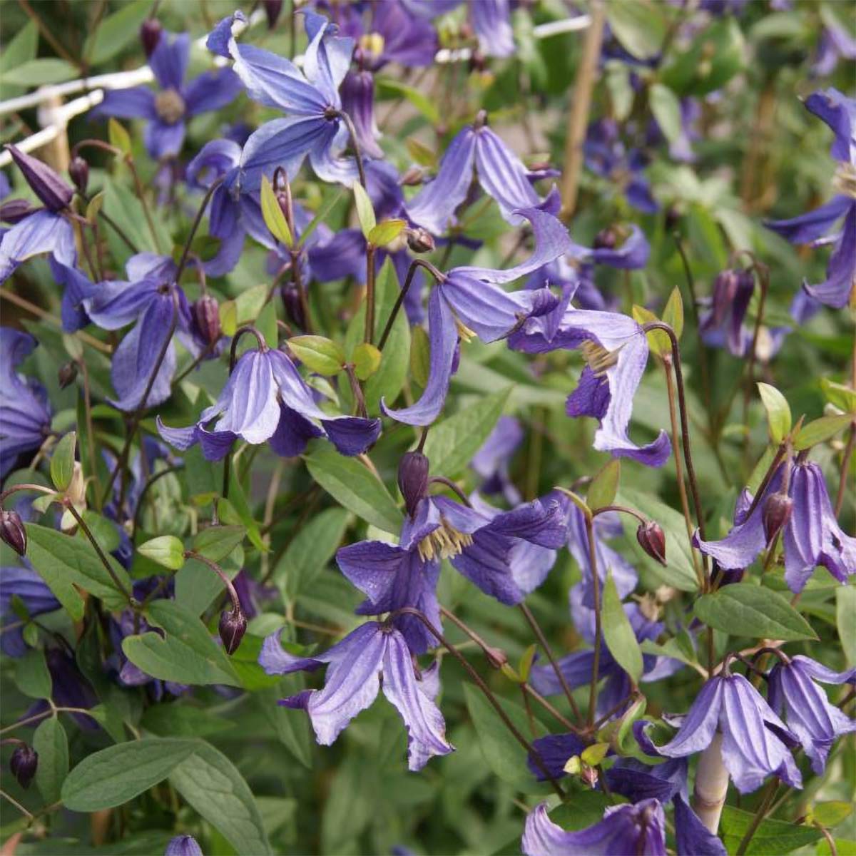 The masses of lightly scented, deep bluish-purple flowers of Clematis hendersonii have slightly twisted out sepals surrounding yellow anthers. A herbaceous scrambling variety or a short climber.