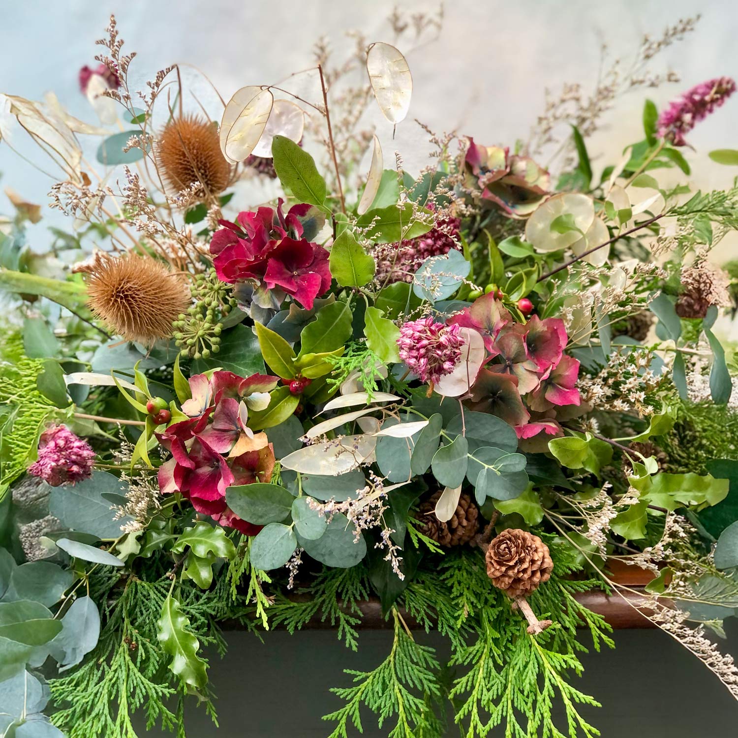 Learn eco-friendly, no floral foam techniques to make the base, use fresh garden greenery and dried flowers to ensure your arrangement lasts over the Christmas period.