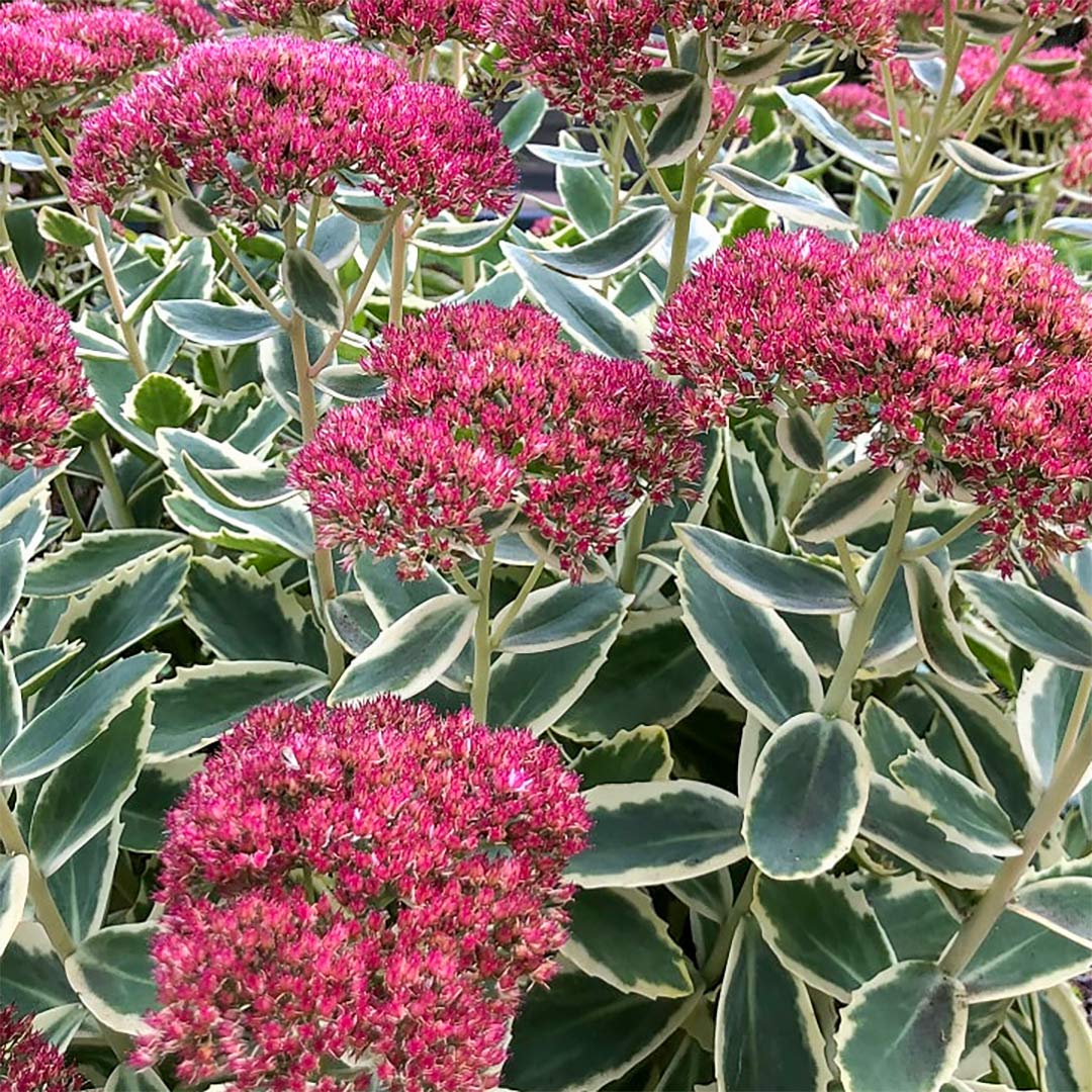 A spectacular plant with the heads of rose-pink flowers held above a clump of green leaves, with a broad creamy-yellow margin. An excellent bee and butterfly plant.
