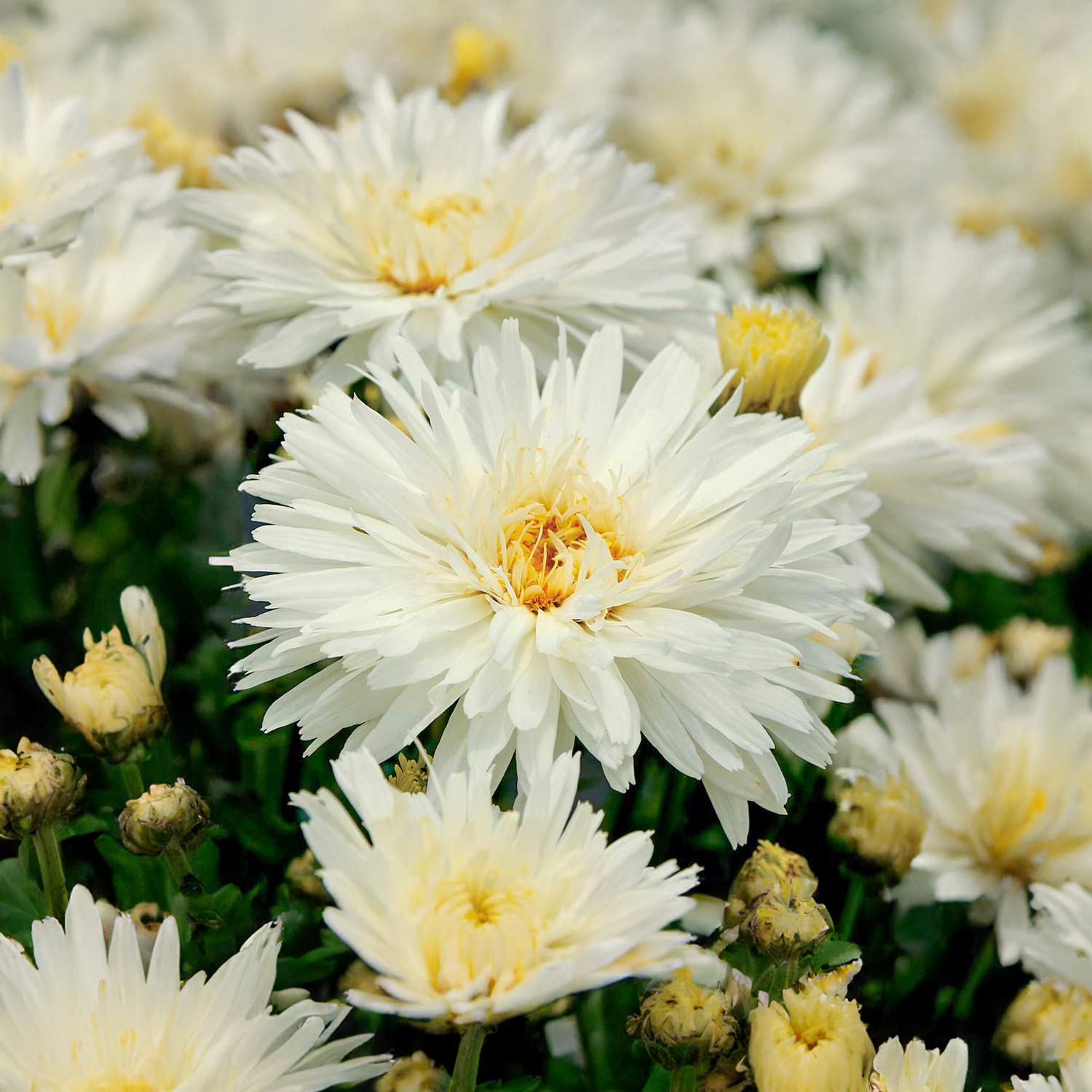 Leucanthemum 'Mount Hood' has frilly, pure white double flowers with a light-yellow centre that emerge on tough lanceolate green foliage. Ideal for the garden bed, border and container.